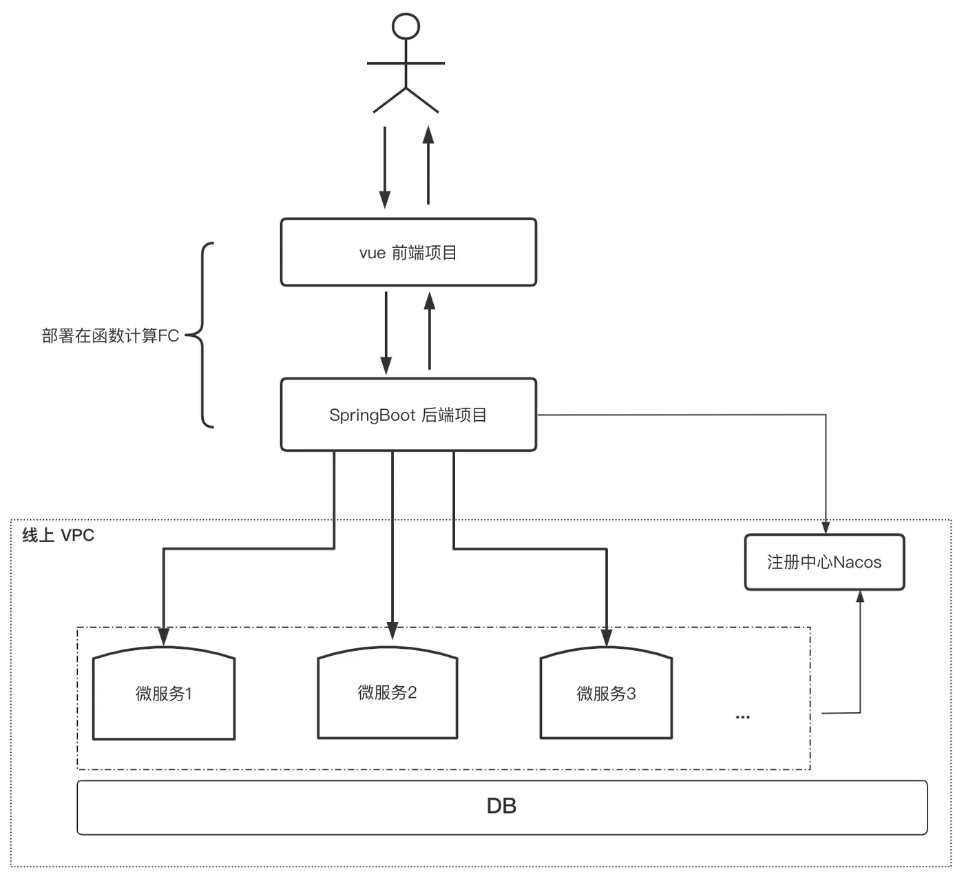 小王将迭代最频繁的对外的前后端分离的项目都一键迁移到函数计算的 Custom Runtime,在其中 SpringBoot 的项目需要能使用各种 VPC 内网地址访问下游服务(比如注册中心或者其他微服务接口), 这个时候Serverless Devs 提供的端云联调 就可以派上用场了, 只需要在 s.yaml (s.yaml 中定义了函数的 VPC 配置) 所在目录下执行: