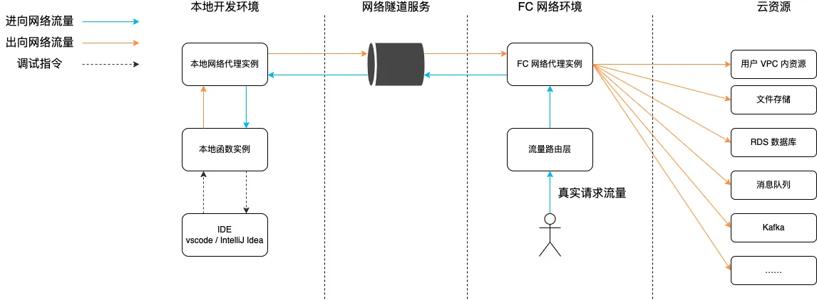 - 启动本地环境的代理容器实例, 通过通道服务, 和 1 中的 FC 网络代理容器实例建立一条双向通信 TCP 隧道。