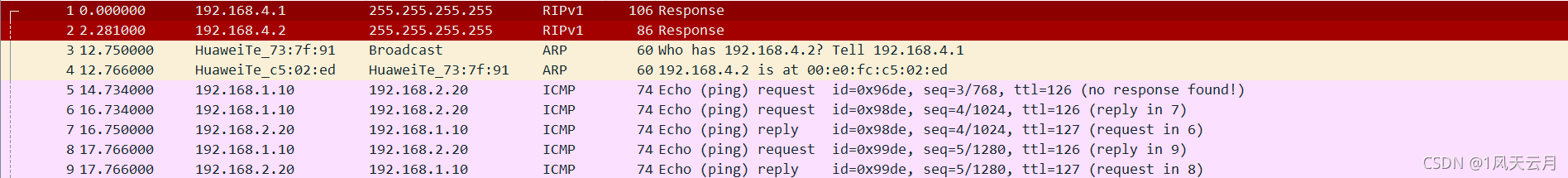 RIPv1(即RIP version1)是有类别路由协议(Classful Routing Protocol),它只支持以广播方式发布协议报文,RIPv1的协议报文中没有携带掩码信息,它只能识别A、B、C类这样的自然网段的路由,因此RIPv1无法支持路由聚合, 也不支持不连续子网(Discontiguous Subnet)