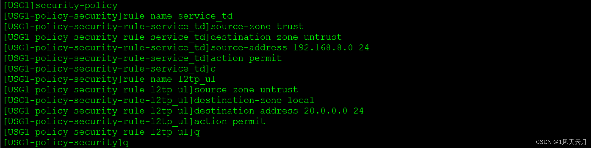 - 移动办公用户访问企业总部内网服务器的业务报文,LNS通过VT接口将移动办公用户访问企业总部服务器的业务报文解封装以后,这些报文经过的安全域间为DMZ->Trust,DMZ区域为LNS上VT接口所在的安全区域,Trust为LNS连接总部内网接口所在的安全区域