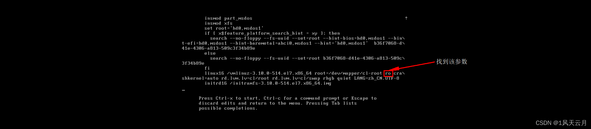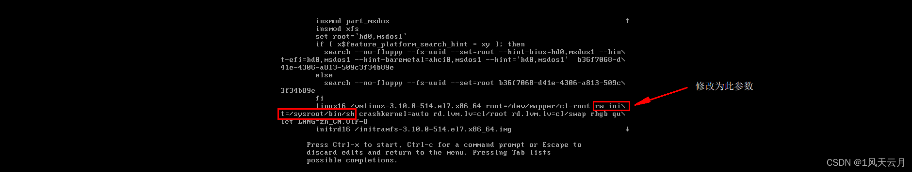 按下键一直翻到下面,找到linux16 /vm....root ro crashdernel=auto这一行,修改ro为rw init=/sysroot/bin/sh