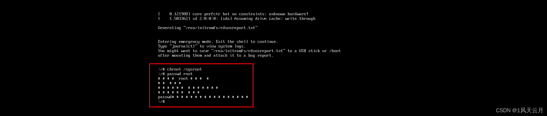 输入命令 chroot /sysroot,然后输入 passwd root 设置用户密码,要输入两次相同密码