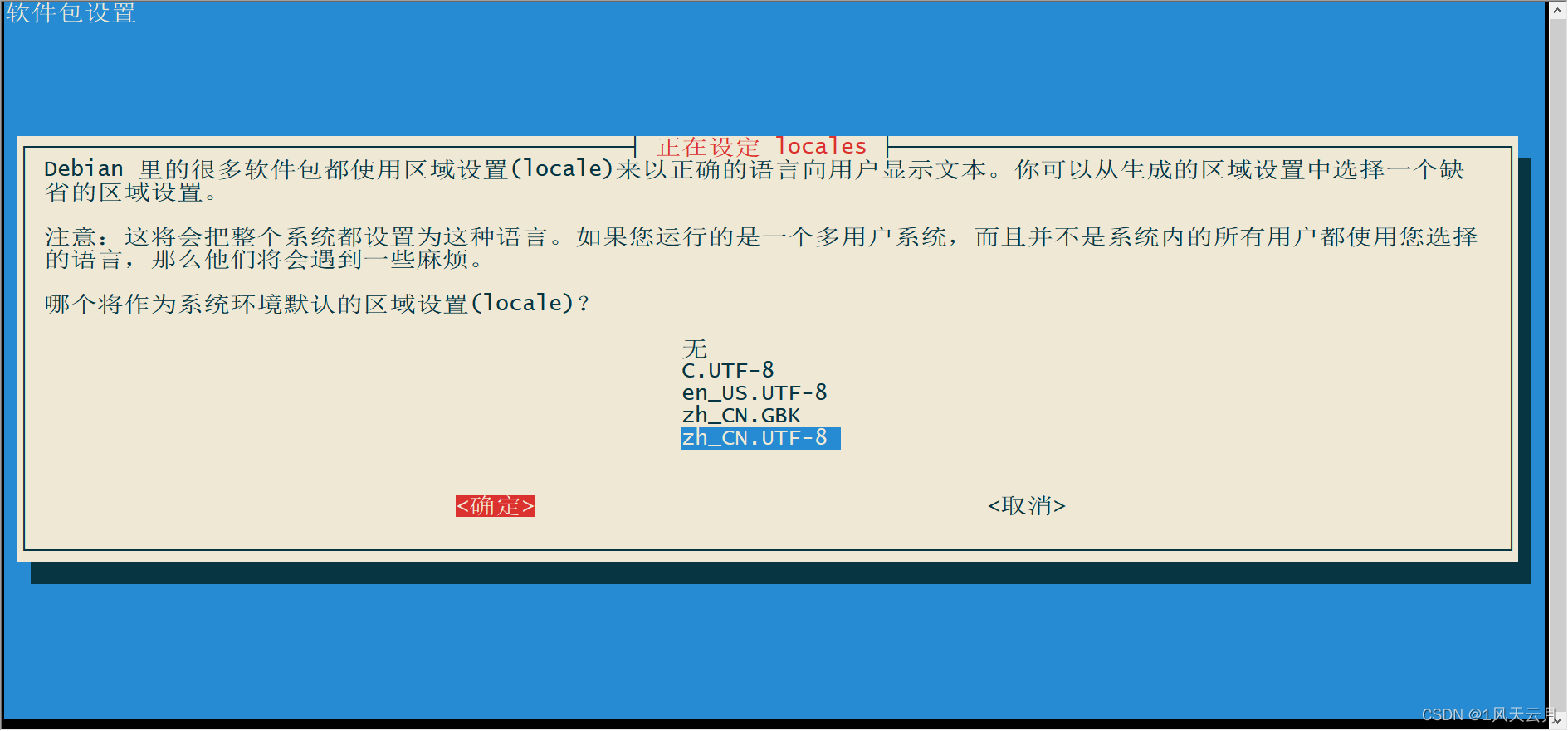 选择 zh_CN.UTF-8 作为区域语言设置,按Tab键切换到[确定]按钮,然后回车确定