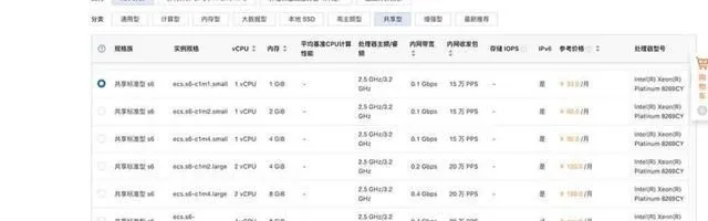 3.选择实列,也就是选择你的服务器配置。这里有很多配置,我就只列举一下新手需要的配置:1VCPU,2Gbit就可以满足需求了更多的实例我抽时间写一个适合不同行业的。