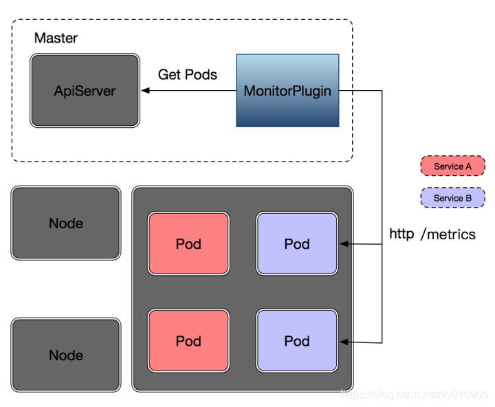 在Kubernetes的master节点,也就是安装apiserver的那台服务器上运行一个监控插件,该插件可以通过一个kubernetes提供的官方客户端来访问apiserver,首先我们要告知插件要监控哪个namespace下的哪个service,然后,插件通过和apiserver进行交互获取某个service下所有Pods的实例,插件会并发访问所有pod提供的/metrics接口(Path可配),并给每个pod的返回数据(json格式,遵守一定的数据格式契约)打上pod_name的标签来标识每个pod返回的metrics,打上pod_name标签的同时也会打上service_name的标签用来区分具体是哪个service的监控数据。通过插件收集整理后的数据会上传到时间序列数据库中,后续就可以根据数据进行可视化分析以及展示(Granfana),同样若是结合开源监控Prometheus, OWL也可以实现监控报警,只不过结合不同的监控需要返回它们所需要的监控数据格式罢了。