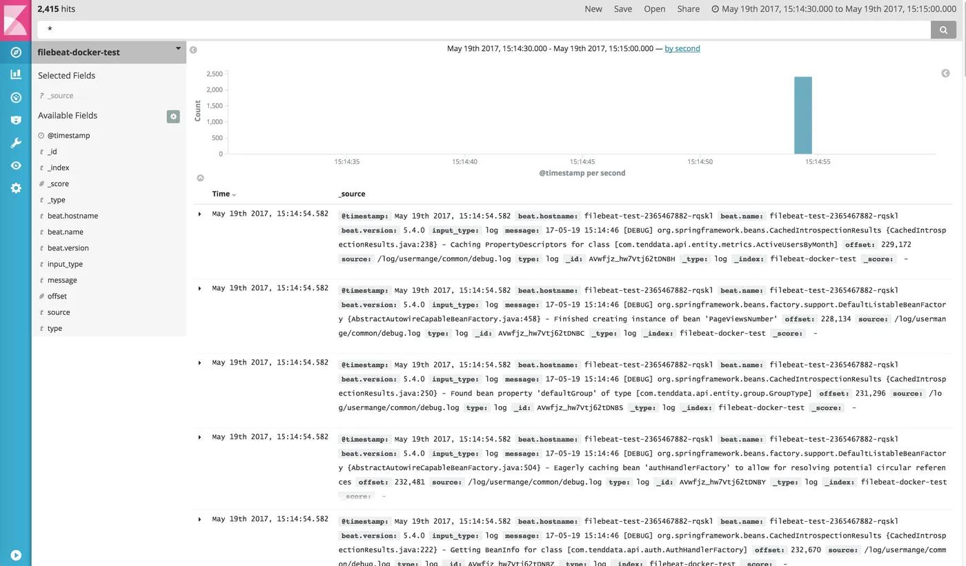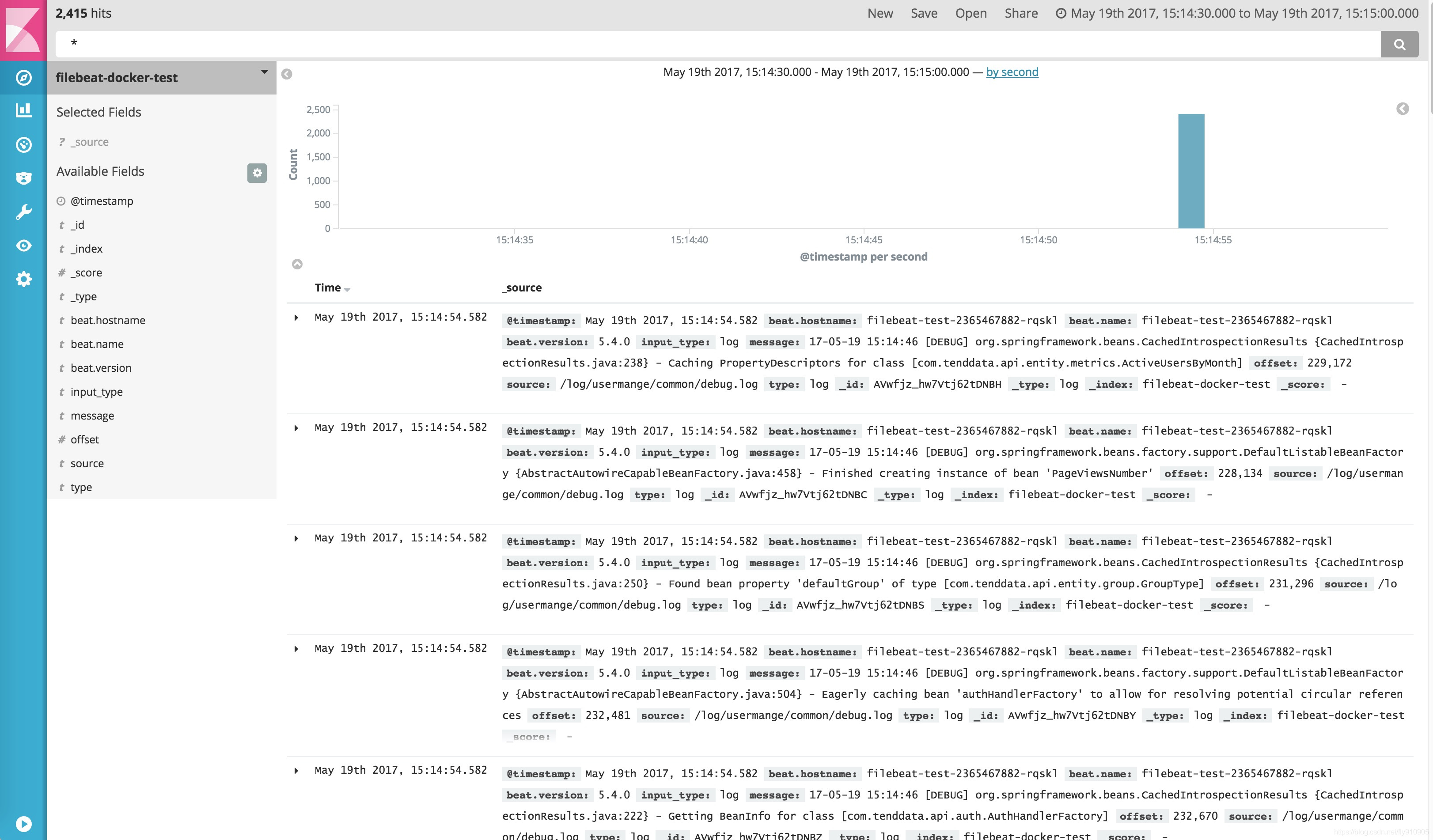 访问Kibana的web页面,查看filebeat-2017.05.17的索引,可以看到filebeat收集到了app日志。