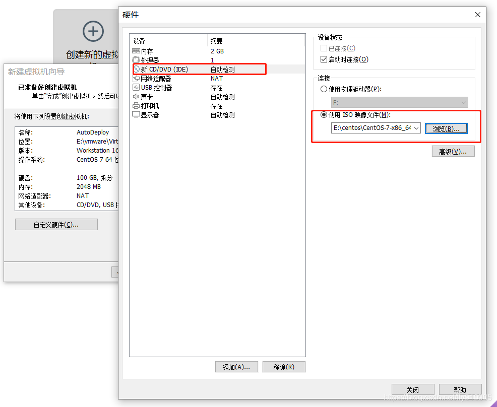 再选择CD/DVD选项,再点击使用ISO映像文件将之前下载的centos7.8的.iso文件选中即可,然后点击确定