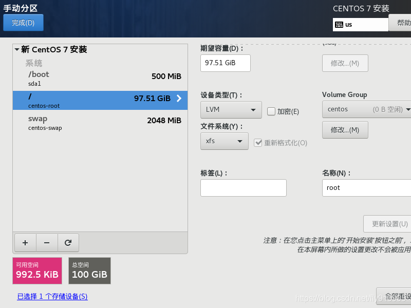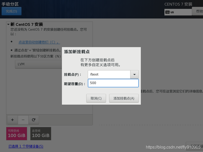 点击 “+” 首先给 /boot 分区 500MB ,再给swap分区分配空间,其大小与内存大小相同,最后将剩下的存储空间都给 / 根分区