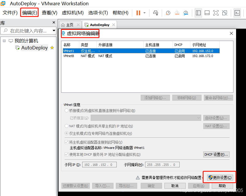 打开vmware虚拟机,我们可以在选项栏的“编辑”下的“虚拟网络编辑器”中看到VMnet0(桥接模式)、VMnet1(仅主机模式)、VMnet8(NAT模式)