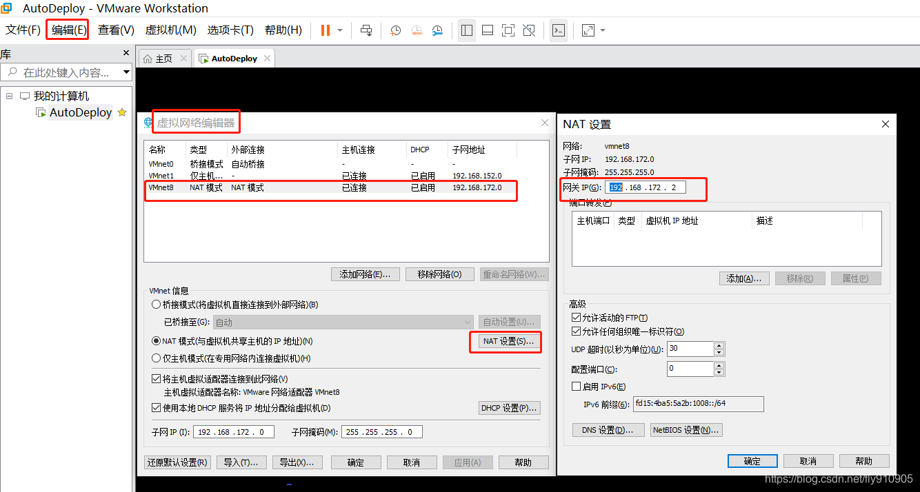 选中 VMnet8(NAT模式)更改设置,在点击NAT设置,可以看到网关IP