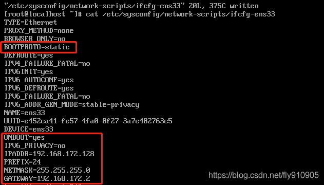 TYPE=Ethernet PROXY_METHOD=none BROWSER_ONLY=no #这里设置为静态IP BOOTPROTO=static DEFROUTE=yes IPV4_FAILURE_FATAL=no IPV6INIT=yes IPV6_AUTOCONF=yes IPV6_DEFROUTE=yes IPV6_FAILURE_FATAL=no IPV6_ADDR_GEN_MODE=stable-privacy NAME=ens33 UUID=1e3590f1-0d13-45f2-b21e-5517815ed041 DEVICE=ens33 #HWADDR=00:0C:29:1D:7D:4F #onboot设置为yes ONBOOT=yes IPV6_PRIVACY=no #IP地址 IPADDR=192.168.172.128 PREFIX=24 #子网掩码 NETMASK=255.255.255.0 #网关 GATEWAY=192.168.172.2