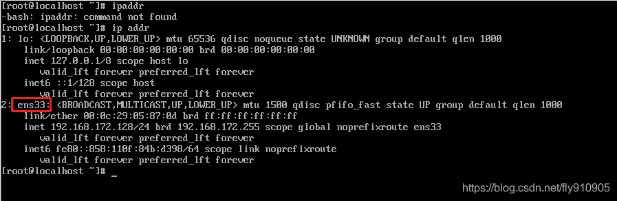 第二个地址是虚拟机的IP地址,其中ens33是网卡的名字。