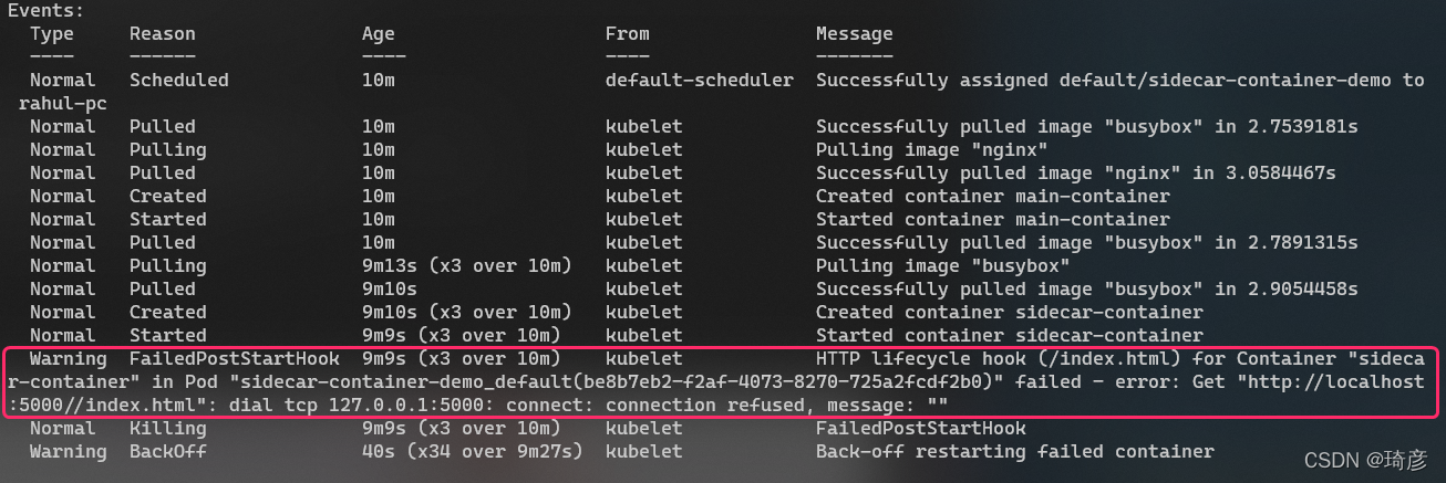 直到postStart执行事件失败,sidecar容器将不断重启。你可以通过修改生命周期检查,来强制 sidecar 容器失败:
