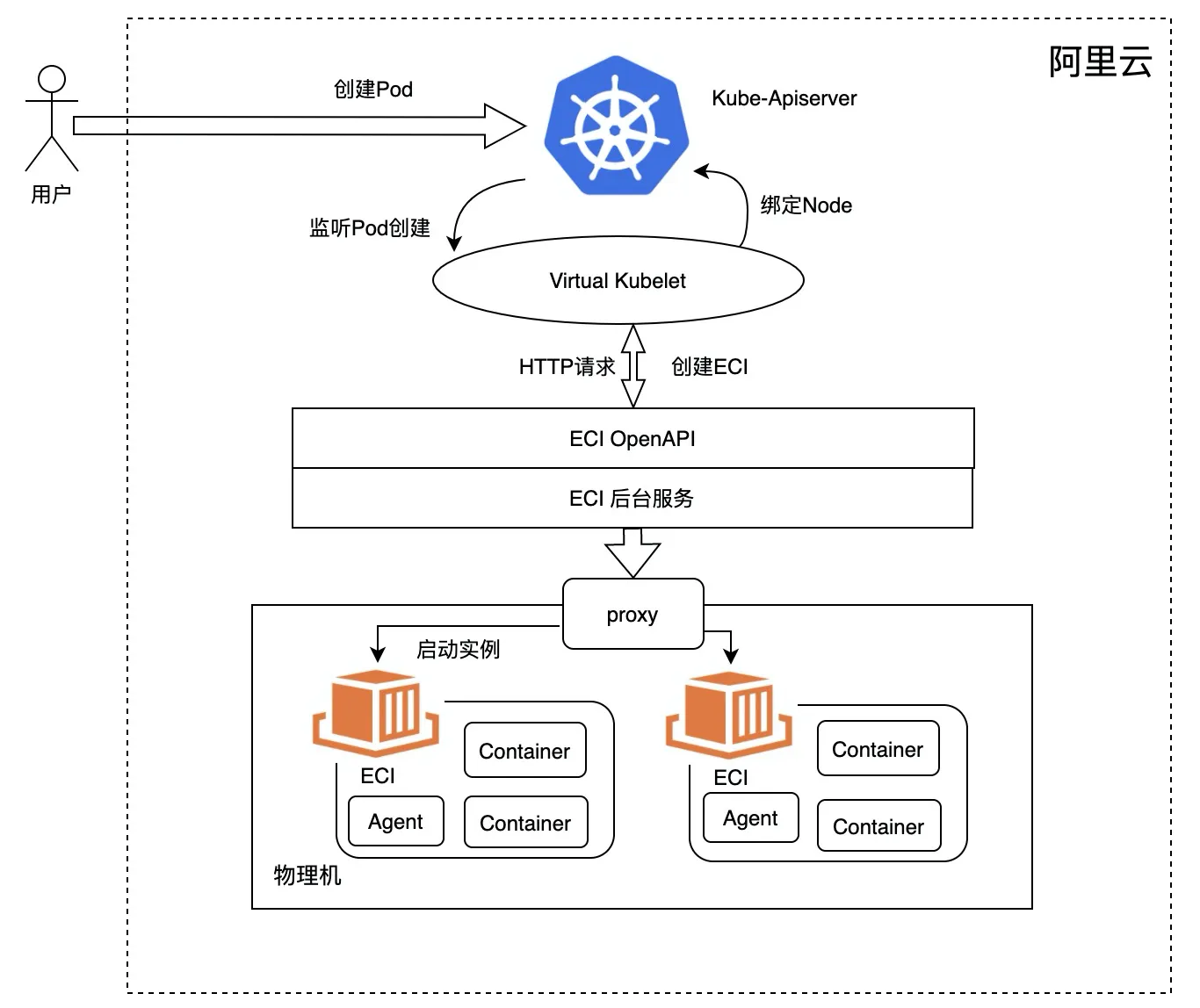 这里大家可能有疑问,上面介绍了 Virtual Kubelet ,而 ECI 里面还有一个精简的 Kubelet,两者是不是存在冲突?