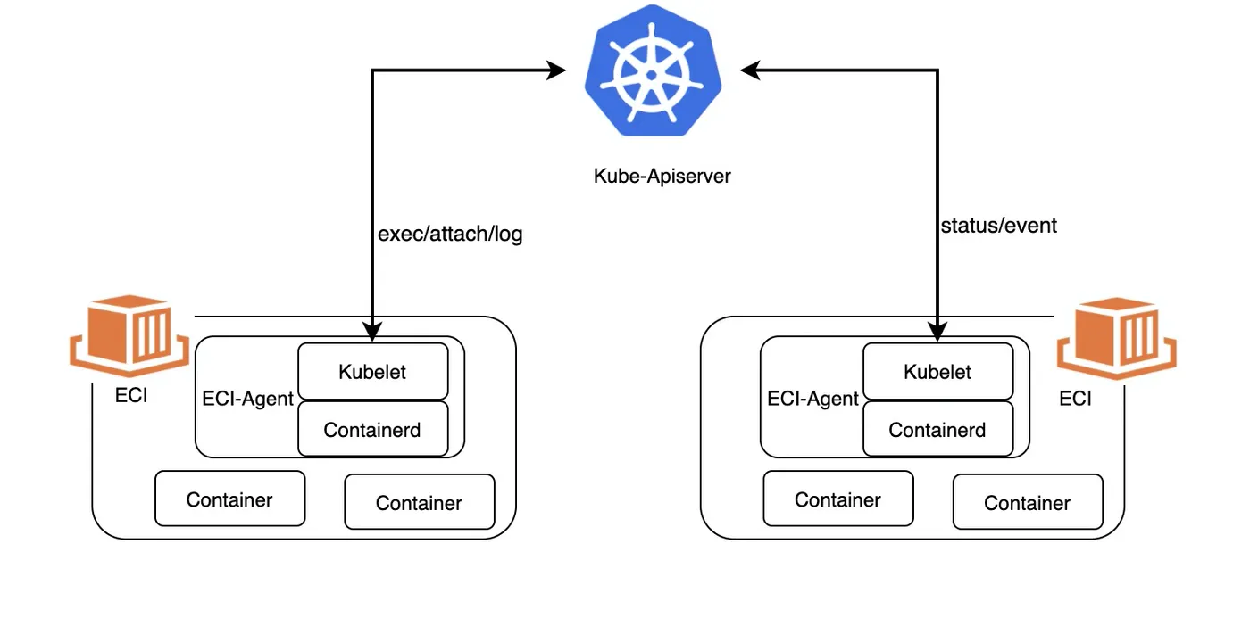 大家都知道,原生 Kubelet 主要工作是负责监听 kube-apiserver,当发现有 Pod 调度到本机后则会执行创建 Pod(拉起容器),并且上报状态。所以,我们这里将原生 Kubelet 拆解成两个部分:负责监听 kube-apiserver 的 Virtual Kubelet 和 ECI-Agent 里真正启动 Pod 容器和上报状态的精简 Kubelet。