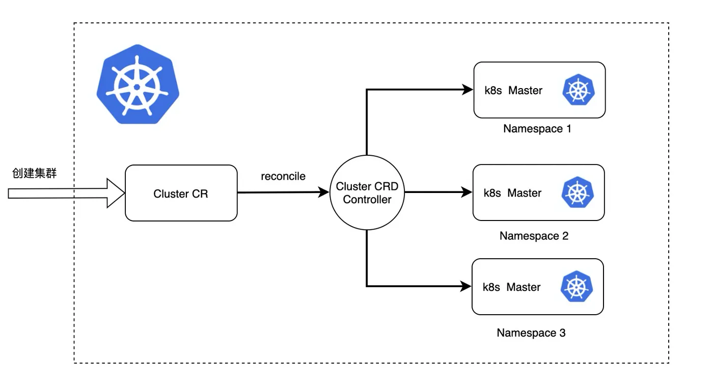 这里我们使用了“k8s on k8s”的方案,借助 k8s 的能力运维用户的 k8s master。由于 k8s master 的配置项比较多,很难通过一个 Deployment 或者 Statefulset 表达,为了灵活控制,我们使用 k8s CRD(CustomResourceDefinition),将 k8s 集群抽象成一个 Cluster CRD,当用户在控制台创建一个 ASK 集群的时候,后台便会提交一个 Cluster CR。于是,CRD 控制器便会为每个集群单独创建一个 Namespace,并在这个 Namespace 里面创建 Etcd 和 k8s master (etcd、kube-apiserver、controller manager)集群。