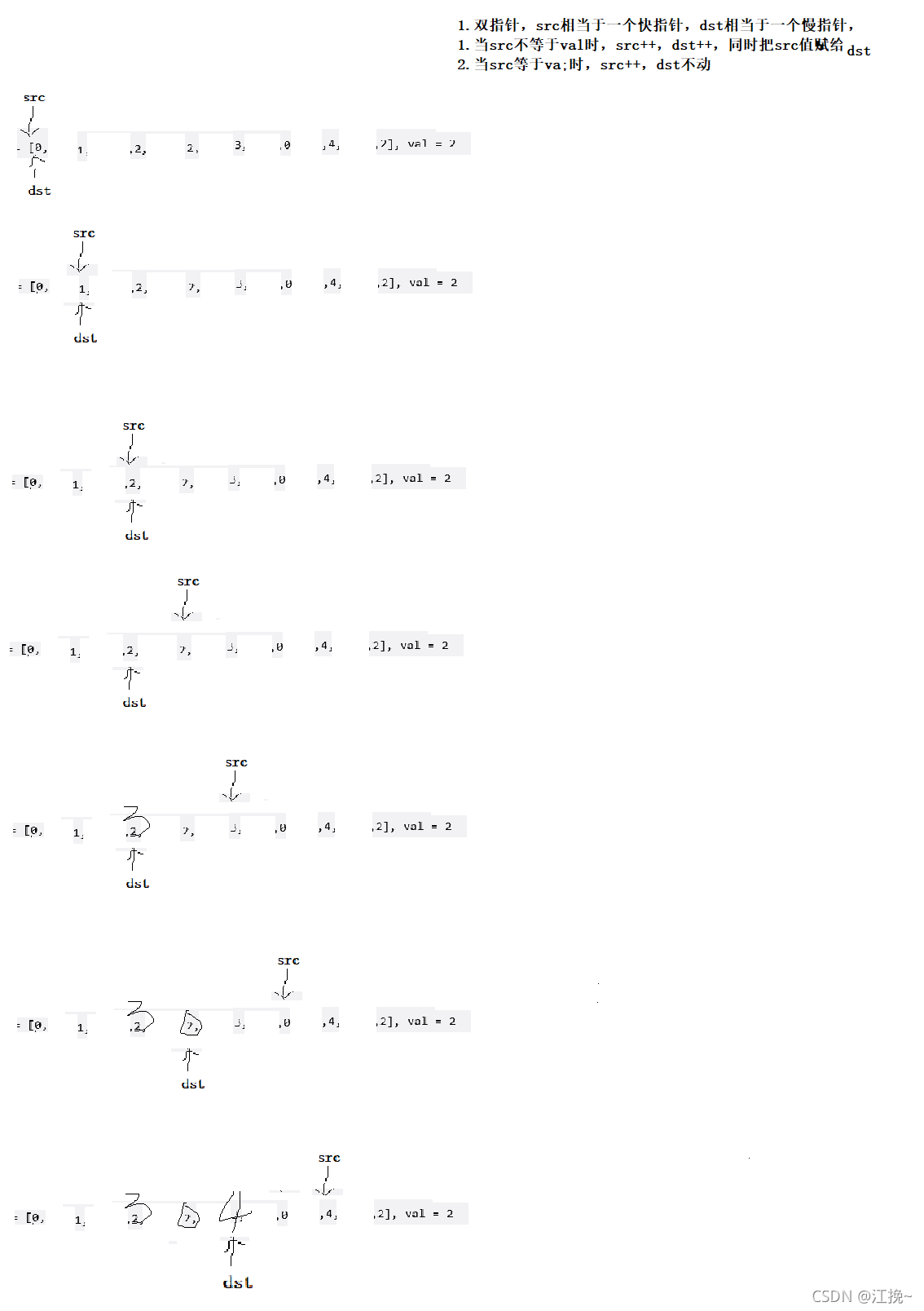 int removeElement(int* nums, int numsSize, int val){ int len=numsSize; int i=0; for(i=0;i<numsSize;i++) { if(nums[i]==val)/当nums的元素和val一致时 { int start=i+1;/把这个元素消掉,就把这个元素给覆盖掉 while(start<numsSize)//当start的值到numssize时就停止 { nums[start-1]=nums[start];//前一个的值等于后一个的值 start++; } len--;//每执行一次,就把len--,最终返回的就是len的值 } } return len; }