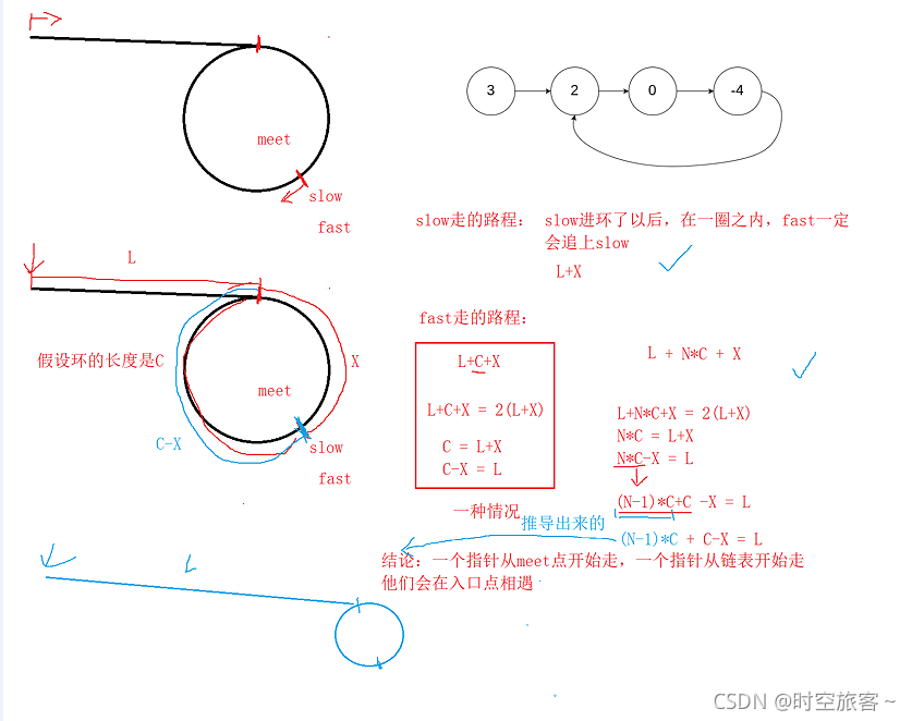 * struct ListNode { * int val; * struct ListNode *next; * }; */ struct ListNode *detectCycle(struct ListNode *head) { struct ListNode*slow=head; struct ListNode*fast=head; struct ListNode*mid=NULL; struct ListNode*init=head; while(fast&&fast->next) { fast=fast->next->next; slow=slow->next; if(fast==slow) { mid=fast;//mid在环里面,而init在环外面,相遇的节点就是进入的节点 while(mid!=init) { mid=mid->next; init=init->next; } return mid; } } return NULL; }
