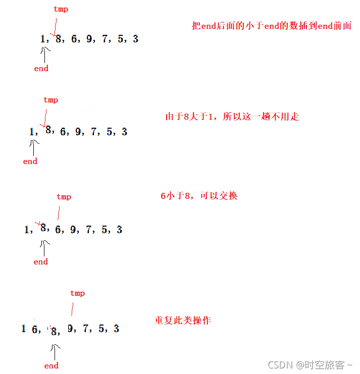 void insertsort(int *arr, int n) { int i; for (i = 0; i < n - 1; i++) { int end = i; int tmp = arr[end + 1]; while (end >= 0) { if (tmp < arr[end]) { arr[end + 1] = arr[end]; end--; } else { break; } } arr[end+1] = tmp;//因为走到了要求的数的前一个位置,那么他的后一位就是我们要插入的位置 } }