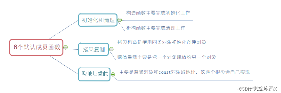 class Date { public: //这可以用缺省参数来合成一个 //Date()//函数名相同,没有返回值 //{ // year_ = 0; // month_ = 1; // day_ = 1; //} //Date(int year,int month,int day)//函数重载 //{ // year_ = year; // month_ = month; // day_ = day; //} Date(int year=0, int month=1, int day=2)//函数重载,全缺省更好用,推荐全缺省或者版半缺省 { year_ = year; month_ = month; day_ = day; } private: //c++里面把类型分为两类,内置类型(基本类型),自定义类型 //内置类型,int,double,long ,int arr[] //自定义类型:struct class //我们不写编译器默认生成的构造函数,对于内置类型不做初始化处理 //对于自定义类型回去调用他的无参默认构造函数(不用参数就可以调用的)初始化 //默认构造函数,1.无参的2.全缺省的。3,我们不写,编译器自己默认生成的 //如果没有默认构造函数就会报错 int year_; int day_; int month_; A _aa; }; int main() { //自动调用 Date d;//这就是对象的实例化 //year=0,day=1,month=1 Date d2(2022, 1, 15); //year=2022,month=1,day=15 Date d3(2022); Date d4 (2022, 3); return 0; }