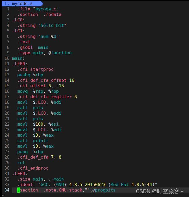 gcc -S mycode.c(-S,开始进行程序的翻译,完成编译之后就停下来就不要往后走了)