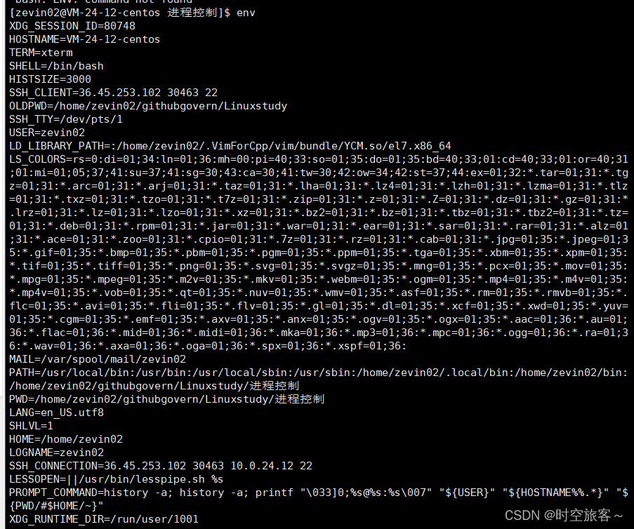 1 #include<stdio.h> 2 #include<unistd.h> 3 int main(int argc ,char* argv[],char *env[])//可以获得环境变量的字符串数组,和argv相类似 4 //argv是一个字符串数组,有argc个变量 5 { 6 int j=0; 7 for(j=0;env[j];j++)//这个是系统自动给我们添加的,所以不带数字的参数 8 { 9 ? printf("%s ",env[j]);//因为最后一个数据是NULL 10 } 11 int i=0; 12 for(i=0;i<argc;i++) 13 { 14 ? printf("argv[%d]=%s\n",i,argv[i]); 15 } 16 // int cnt=5; 17 // while(cnt--) 18 // { 19 // // printf("I am a process ,pid %d,ppid %d\n",getpid(),getppid()); 20 // sleep(1); 21 // printf("I am a cmd -->process\n"); 22 // 23 // } 24 return 0; 25 }