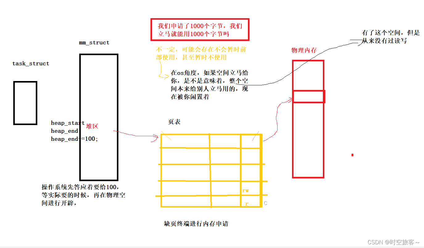 如我想我爸要8000,我爸答应了,(进程向操作系统要空间,操作系统同意了,在进程地址空间里面开了地址,),到实际要钱的时候,爸发现钱不够,就借钱,各种渠道,把钱给我,(OS通过内存管理算法,把一些没在用的空间,给进程)