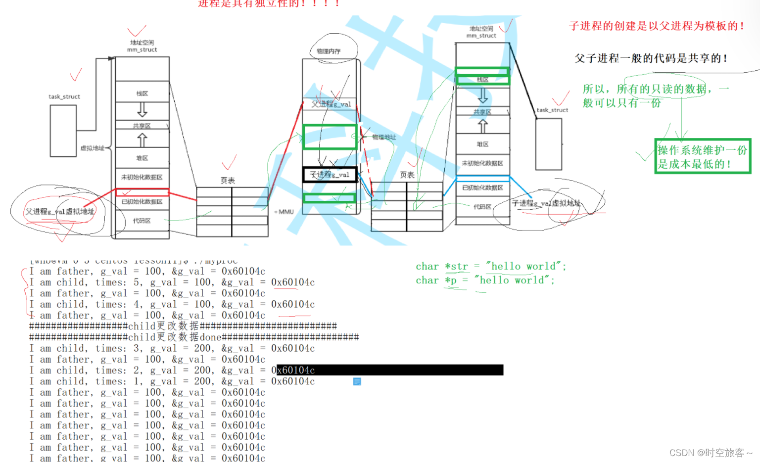 24 void test2() 25 { 26 if(fork()==0) 27 { 28 //child 29 int cnt=5; 30 while(cnt) 31 { 32 printf("I am child,time %d,g_val %d,&g_val %p\n",cnt,g_val,&g_val); 33 cnt--; 34 sleep(1); 35 if(cnt==3) 36 { 37 g_val=200; 38 39 } 40 } 41 } 42 else 43 { 44 ? //parent 45 while(1) 46 { 47 48 printf("I am father,g_val %d,&g_val %p\n",g_val,&g_val); 49 sleep(1); 50 } 51 } 52 } 53