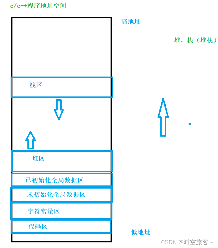 1 #include<stdio.h> 2 #include<stdlib.h> 3 int g_unval; 4 int g_val=100; 5 6 int main() 7 { 8 const char* s="hello world";//在字符常量区域保存 9 printf("code addr: %p\n",main); //代码区 10 printf("string rdonly addr: %p\n",s); 11 printf("uninit addr: %p\n",&g_unval); 12 char* heap=(char*)malloc(sizeof(char)); 13 printf("heap affr :%p \n",heap);//我们要读到堆区的地址,而不是heap,heap是在栈区开辟的地址, 14 printf("stack addr: %p\n",&s);//s也是在栈上开辟的地址, 15 printf("stack addr: %p\n",&heap);//heap也是在栈上开辟的地址, 16 int a=0; 17 int b=9; 18 19 printf("stack addr: %p\n",&a);//a也是在栈上开辟的地址, 20 printf("stack addr: %p\n",&b);//b也是在栈上开辟的地址, 21 return 0; 22 } ~