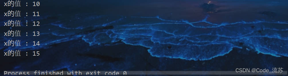 public static void main(String args[]) { int x = 10; while( x < 16 ) { System.out.print("x的值 : " + x ); x++; System.out.print("\n"); } }