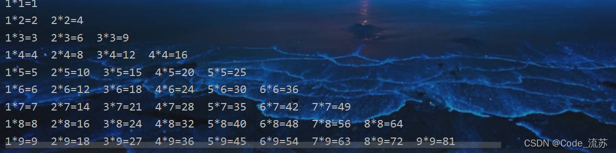 public static void main(String[] args) { for (int i = 1; i <10; i++) { for (int j = 1; j <= i; j++) { System.out.print(j + "*" + i + "=" + i * j + " "); } System.out.println(); } }