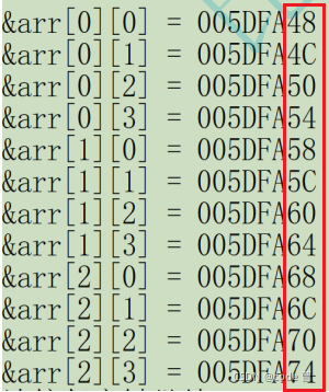 #include <stdio.h> int main() { int arr[3][4]; int i = 0; for(i=0; i<3; i++) { int j = 0; for(j=0; j<4; j++) { printf("&arr[%d][%d] = %p\n", i, j,&arr[i][j]); }//将3*4的二维数组的每个元素的地址打印出来,来研究其在内存中的存储。 } return 0; }