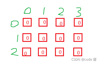 - 代码如下,创建一个3*4的二维数组,并对数组初始化输入和输出。图形如下。