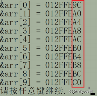 #include <stdio.h> int main() { int arr[10] = {0}; int i = 0; int sz = sizeof(arr)/sizeof(arr[0]); for(i=0; i<sz; ++i) { printf("&arr[%d] = %p\n", i, &arr[i]);//我们将10个元素的地址打印出来。 } return 0; }