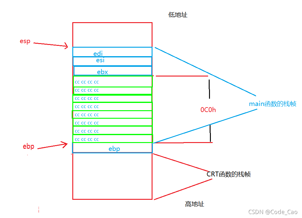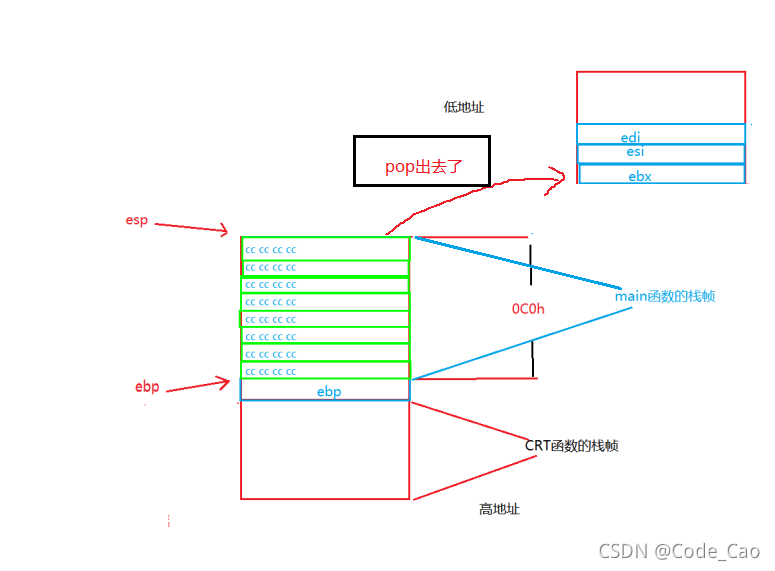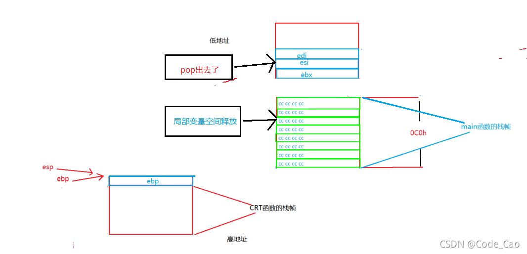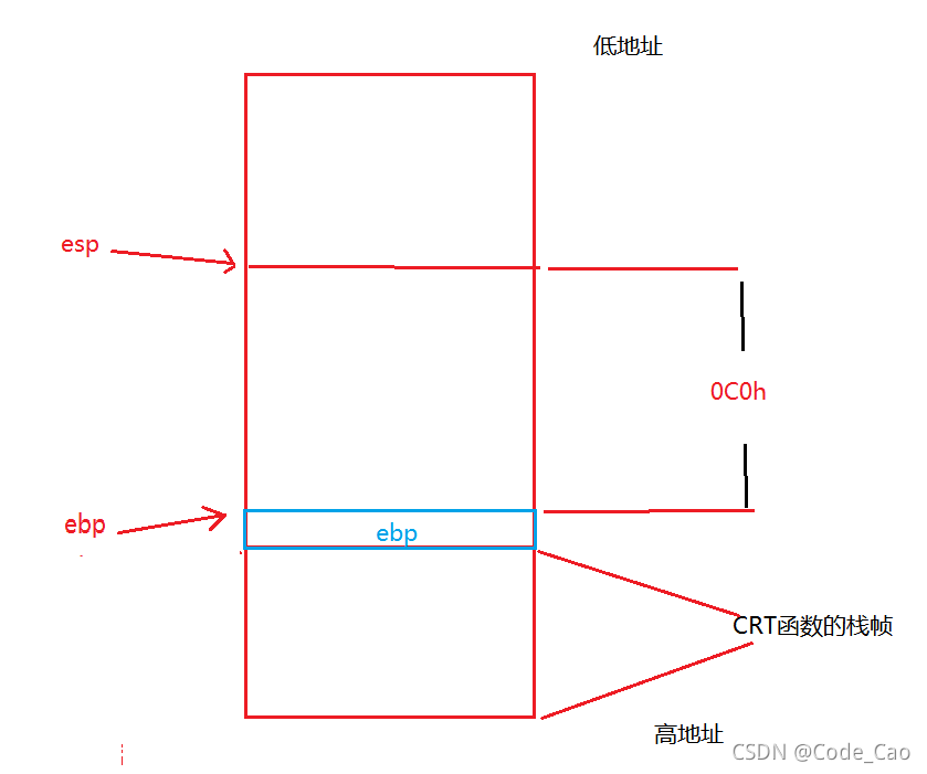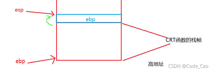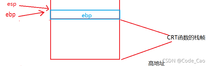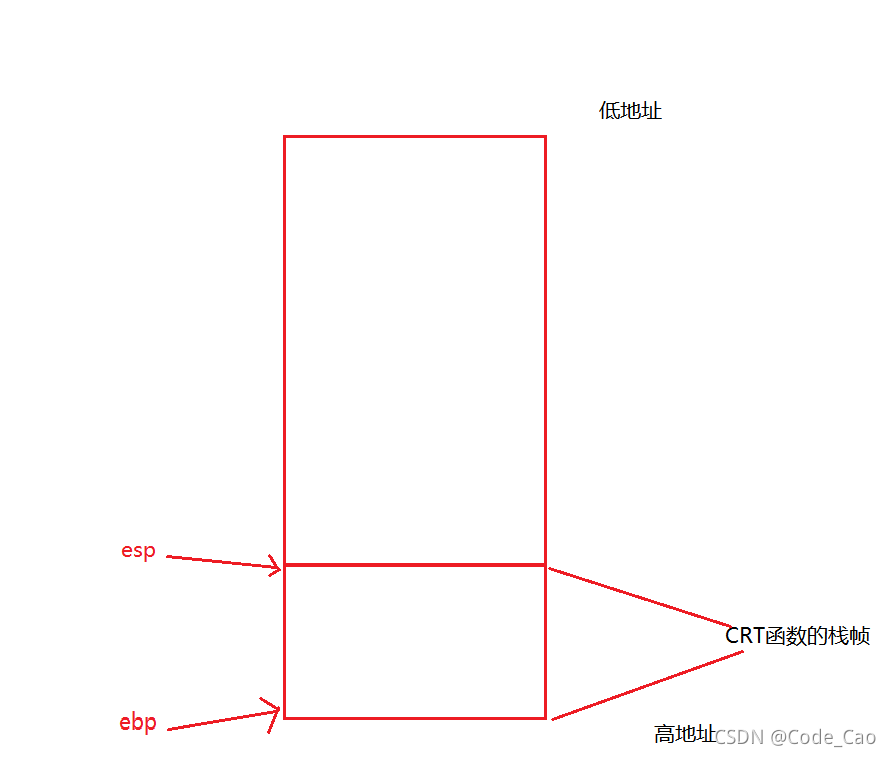 注意:此时ebp和esp没有在维护CRT函数了,但他的函数栈帧没有销毁,因为栈空间的使用只能先销毁低地址,再销毁高地址。即图中的从上往下销毁。