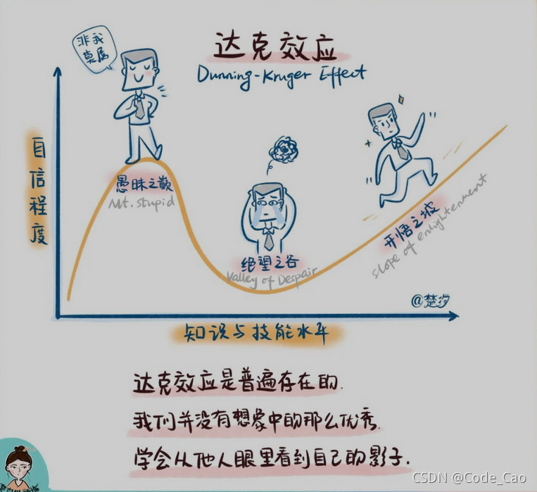 正如图上达克效应一样,横坐标代表技术。纵坐标代表自信。我们并没有想象中的那么优秀,要学会从他人眼里看到自己的影子。也许你现在处于愚昧之巅,也许你处在绝望之谷,不过这都是正常的,只要我们认清自己,持续输出,一定会走向开悟之坡。