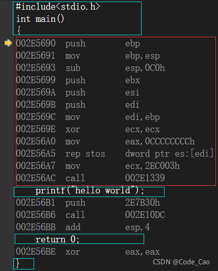 - 这里的call是调用的意思。就是调用printf函数来打印hello world。这里我就不赖细究printf函数怎么调用了。触及到博主目前知识水平极限了。