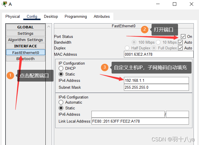 - 配置端口0/0,先点击端口,再点击CLI(一定要先点端口),配置参数