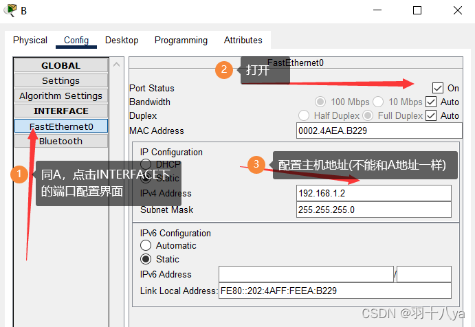 - 地址为192.168.1.1的主机A和地址为192.168.1.2的主机B直接互联