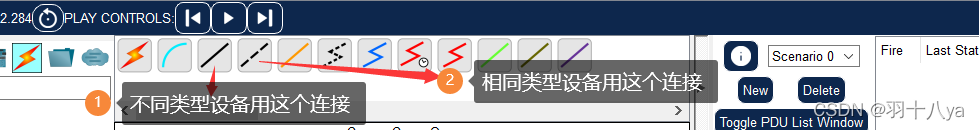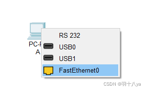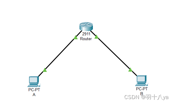 - 建立主机A、B和路由器Router,采用实线,根据要求连接对应端口