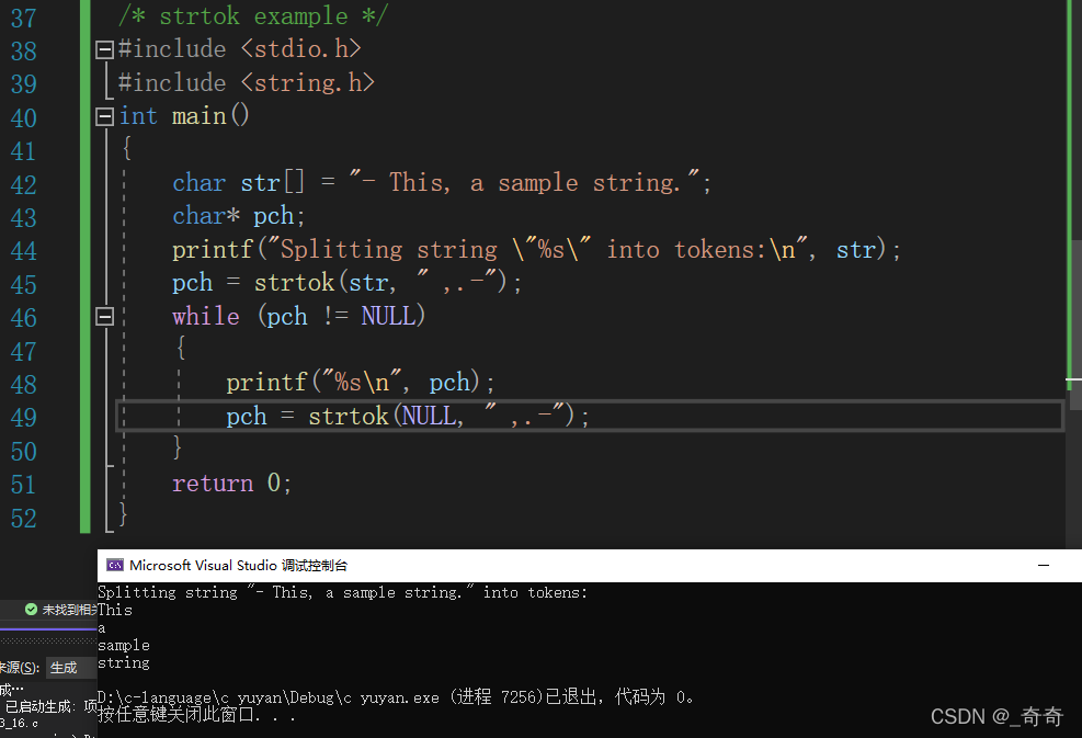 strtok函数找到str中的下一个标记,并将其用 \0 结尾,返回一个指向这个标记的指针。(注:strtok函数会改变被操作的字符串,所以在使用strtok函数切分的字符串一般都是临时拷贝的内容并且可修改。)