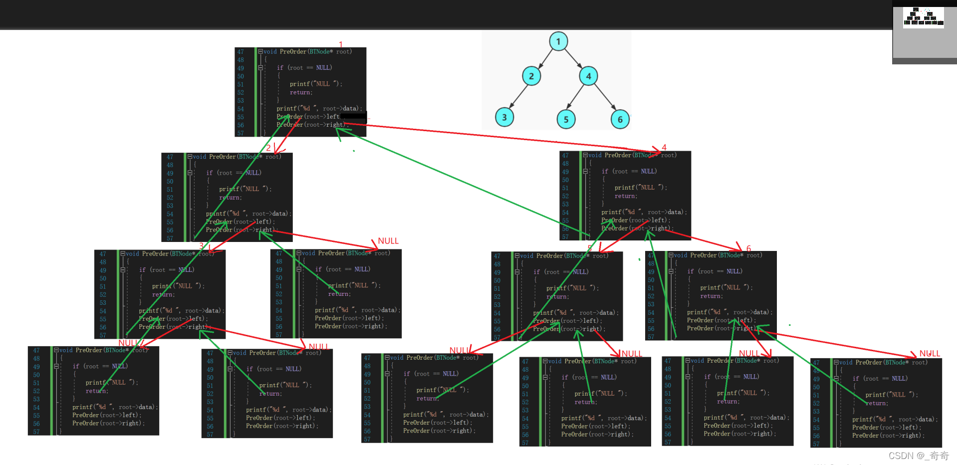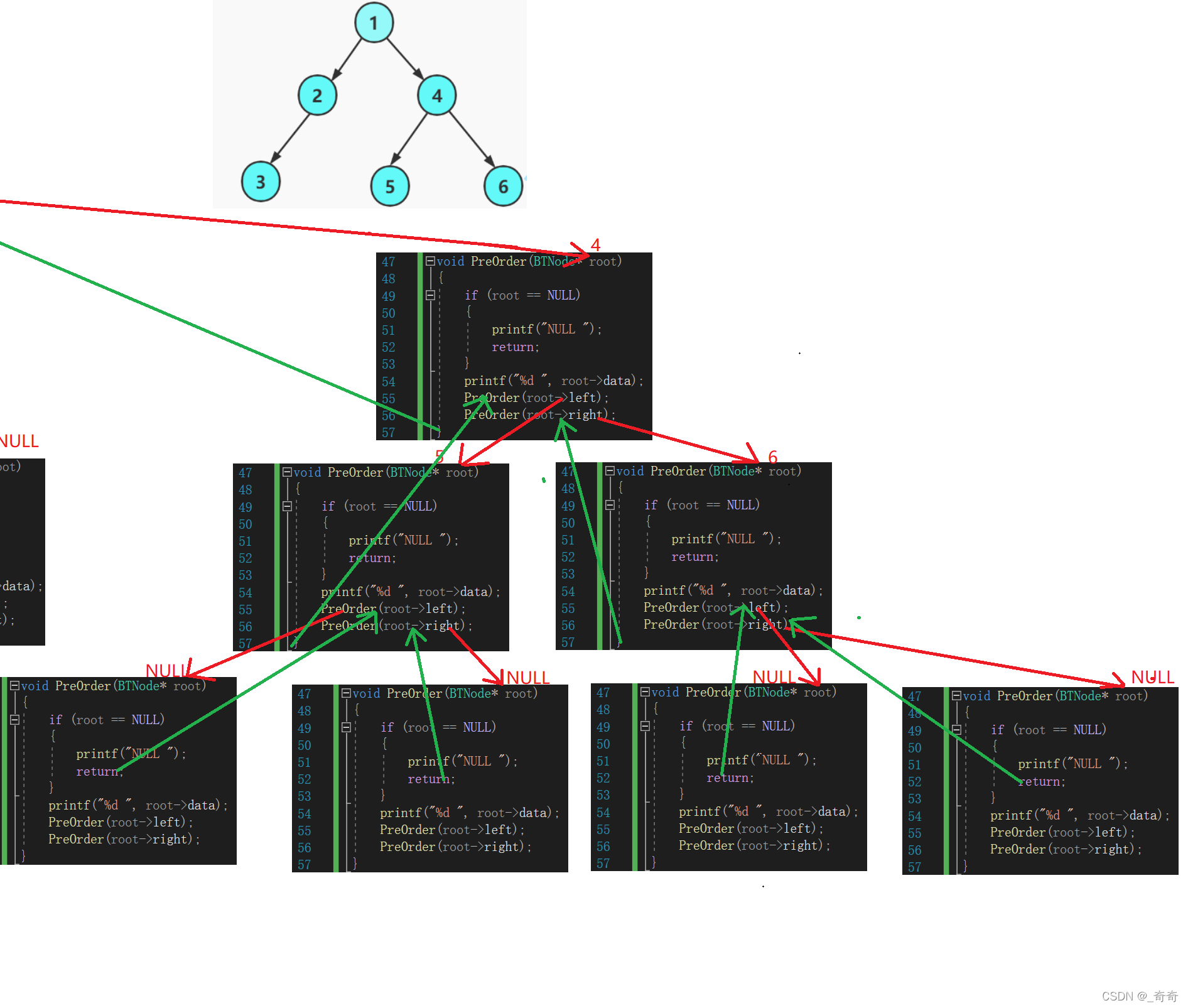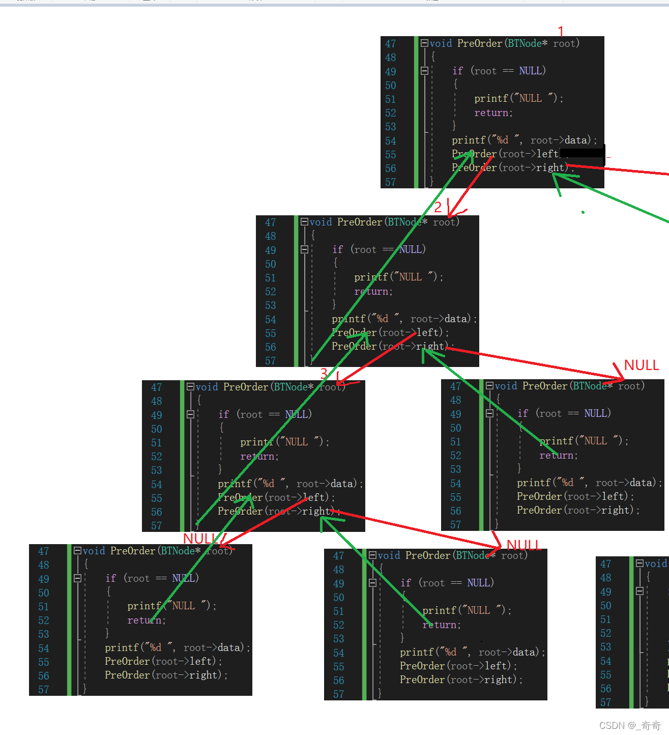 // 二叉树前序遍历 void PreOrder(BTNode* root) { if (root == NULL) { printf("NULL "); return; } //打印在前 printf("%d ", root->data); PreOrder(root->left); PreOrder(root->right); }