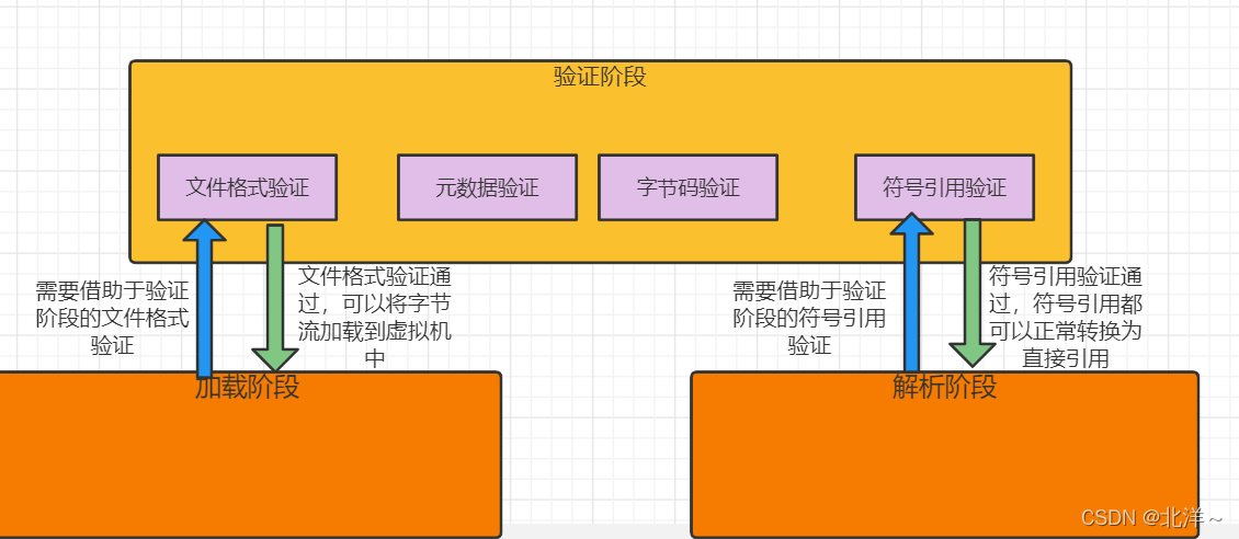 正如开篇所说,这些阶段是互相交叉混合进行的,但是他们的顺序是确定的。这个很好理解,没有加载阶段获得的二进制字节流,那么验证阶段是不知道验证什么的。