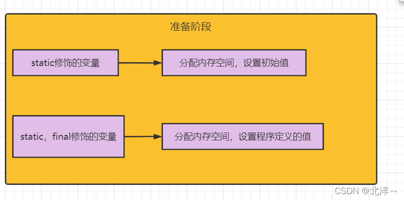 这个阶段做的事情就是为静态变量分配内存,然后赋值(普通静态变量赋默认值,加上final的静态变量直接赋值)。