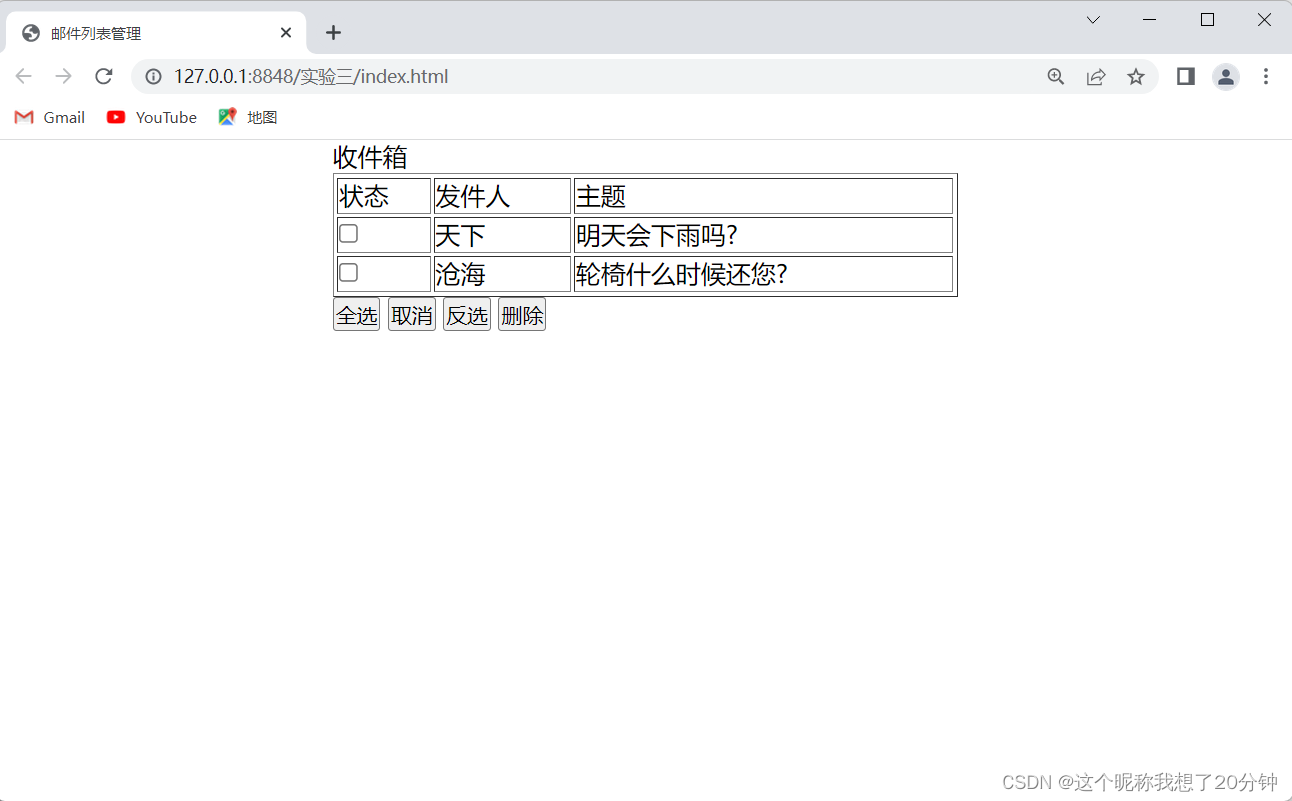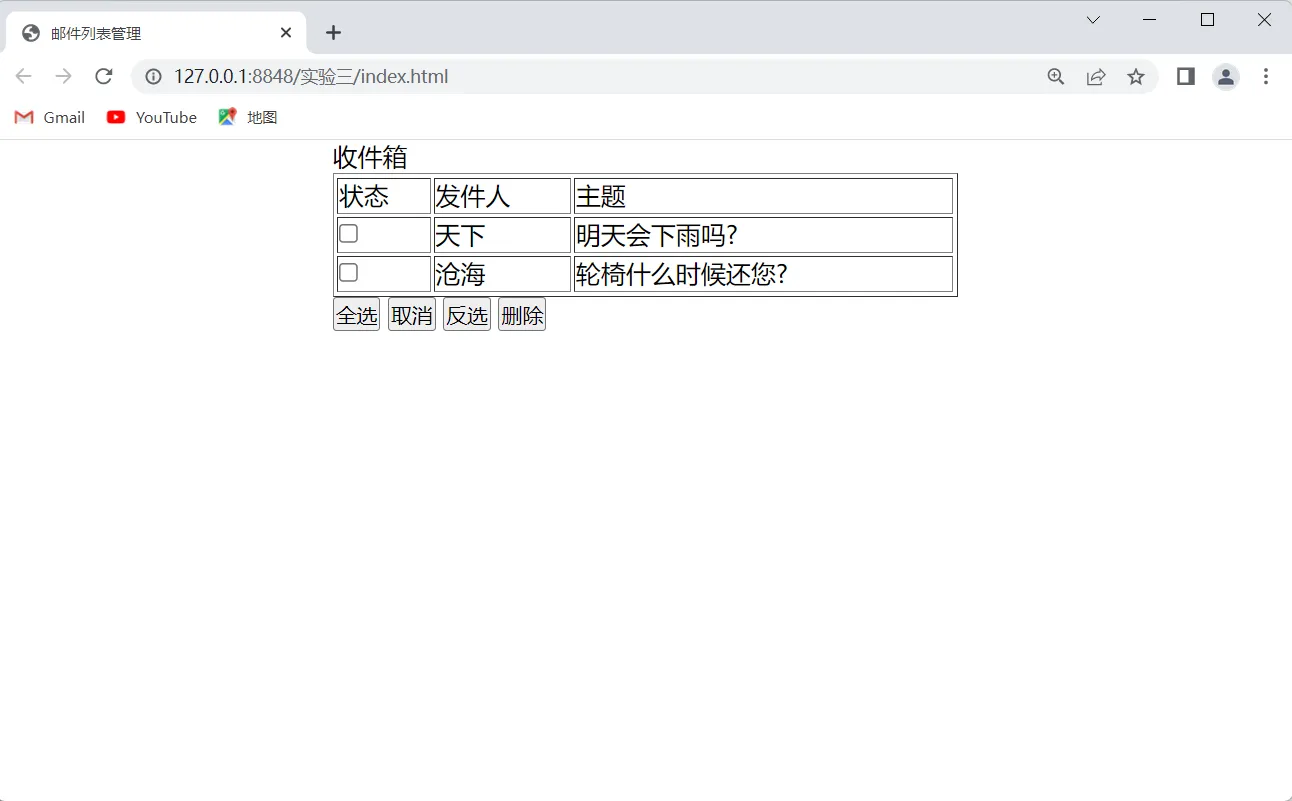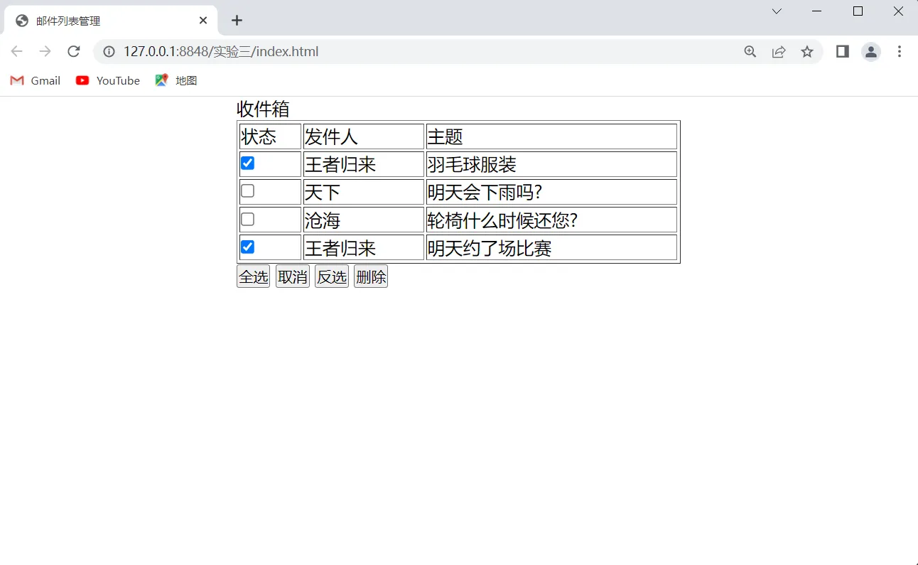<!doctype html> <html> <head> <meta charset="utf-8"> <title>邮件列表管理</title> <style> *{margin:0px; padding:0px;} #box{width:400px;margin:0px auto;} </style> <script src="https://cdn.staticfile.org/jquery/1.10.2/jquery.min.js"></script> <script> $(function(){ $("#selectBtn").click(function(){//全选 $("input[name=select]").prop("checked", true) }); $("#selectCanc1e").click(function(){//取消选择 $("input[name=select]").prop("checked", false) }); $("#notSelect").click(function(){//反选 $("input[name=select]").each(function(index, element){ $(this).prop("checked",!$(this).prop("checked")) }) }); $("#delBtn").click(function(){//删除选中邮件项 $("input[name=select]").each(function(index, element){//判断当前元素是否被选中,如果当前元素被选中, //则删除当前元素的父元素的父元素的所有子元素,即<tr>的所有子元素 if($(this).prop("checked")) $(this).parent().parent().remove(); }); }) }) </script> </head> <body> <div id="box"> <p>收件箱</p> <table width="400" border="1"> <tr> <td>状态</td> <td>发件人</td> <td>主题</td> </tr> <tr> <td><input name="select" type="checkbox" value="select"></td> <td>王者归来</td> <td>羽毛球服装</td> </tr> <tr> <td><input name="select" type="checkbox" value="select"></td> <td>天下</td> <td>明天会下雨吗?</td> </tr> <tr> <td><input name="select" type="checkbox" value="select"></td> <td>沧海</td> <td>轮椅什么时候还您?</td> </tr> <tr> <td><input name="select" type="checkbox" value="select"></td> <td>王者归来</td> <td>明天约了场比赛</td> </tr> </table> <button id="selectBtn">全选</button> <button id="selectCancle">取消</button> <button id="notSelect">反选</button> <button id="delBtn">删除</button> </div> </body> </html>