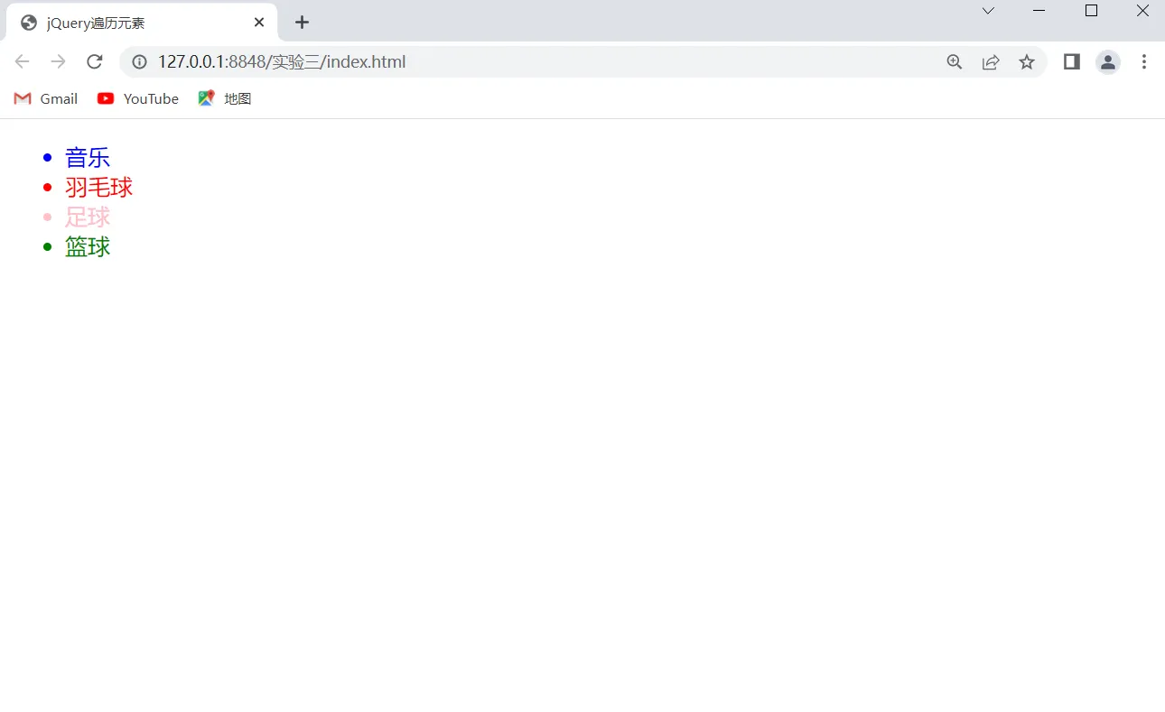 <!doctype html> <html> <head> <title>jQuery遍历元素</title> <script src="https://cdn.staticfile.org/jquery/1.10.2/jquery.min.js"></script> <script> $(document).ready(function(){ var colorArr=new Array("blue","red","pink","green"); $("li"). each(function(index){//遍历本网页中的所有1i元素 this.style.color=colorArr[index];//改变当前1i元素的前景色 }); }); </script> </head> <body> <ul> <li>音乐</li> <li>羽毛球</li> <li>足球</li> <li>篮球</li> </ul> </body> </html>