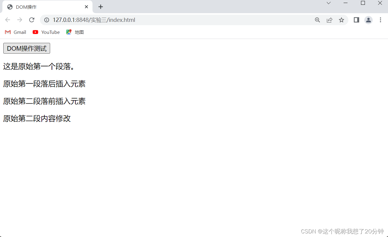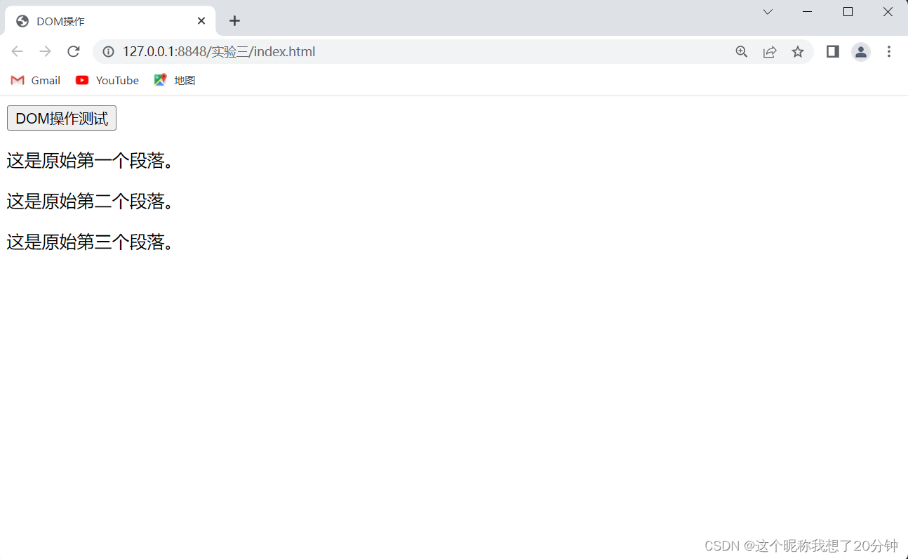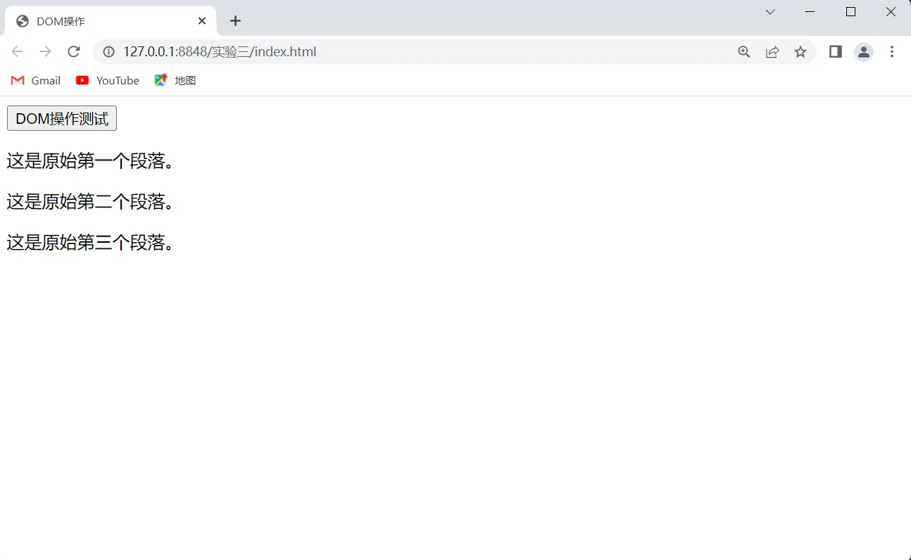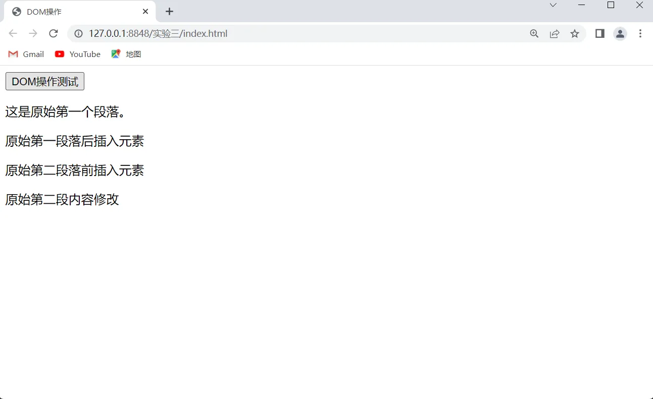例4是管理页面元素的几个方法的示例。首先在页面上有两个<p>段落元素,单击“DOM操作测试”按钮后,在第一个<p>标记后,使用after()方法增加一个段落元素;然后在原始的第二个段落,使用before()增加一个段落元素;使用 replaceWith()方法对原始的第二个段落的内容进行修改;最后使用empty()方法删除原始的第三个段落元素。例4在浏览器初始页面中的显示结果如图3所示,单击按钮后在浏览器中的显示结果如图4所示。