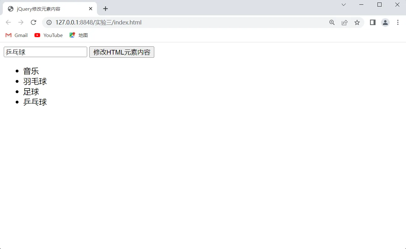 例2中用用户在文本框中输入的数据修改<li>列表的第一个元素和最后一个元素的内容。在浏览器的文本框中输入“乒乓球”,并单击“修改HTML元素内容”按钮,在浏览器中的显示结果如图2所示。