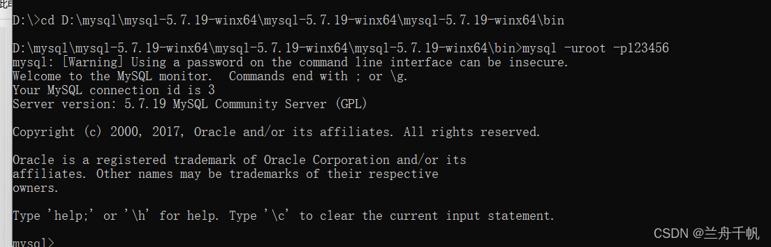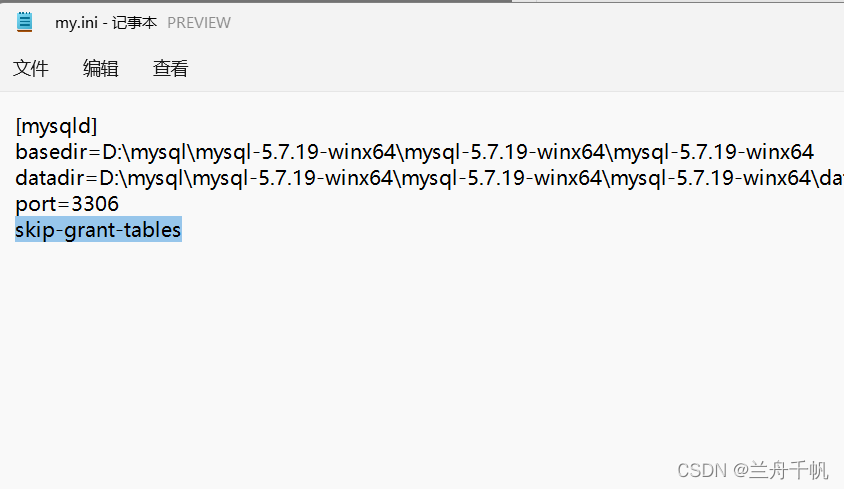 [mysqld] basedir=D:\mysql\mysql-5.7.19-winx64\mysql-5.7.19-winx64\mysql-5.7.19-winx64 datadir=D:\mysql\mysql-5.7.19-winx64\mysql-5.7.19-winx64\mysql-5.7.19-winx64\data port=3306 skip-grant-tables