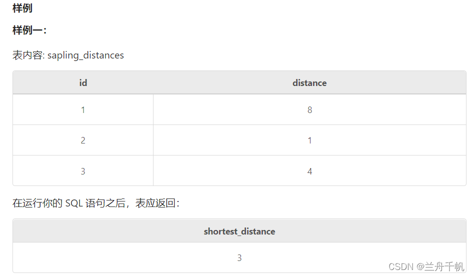 题目的要求就是查询表中距离最近的两棵树之间的距离。并将结果进行重命名(shortest_distance)